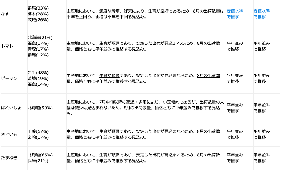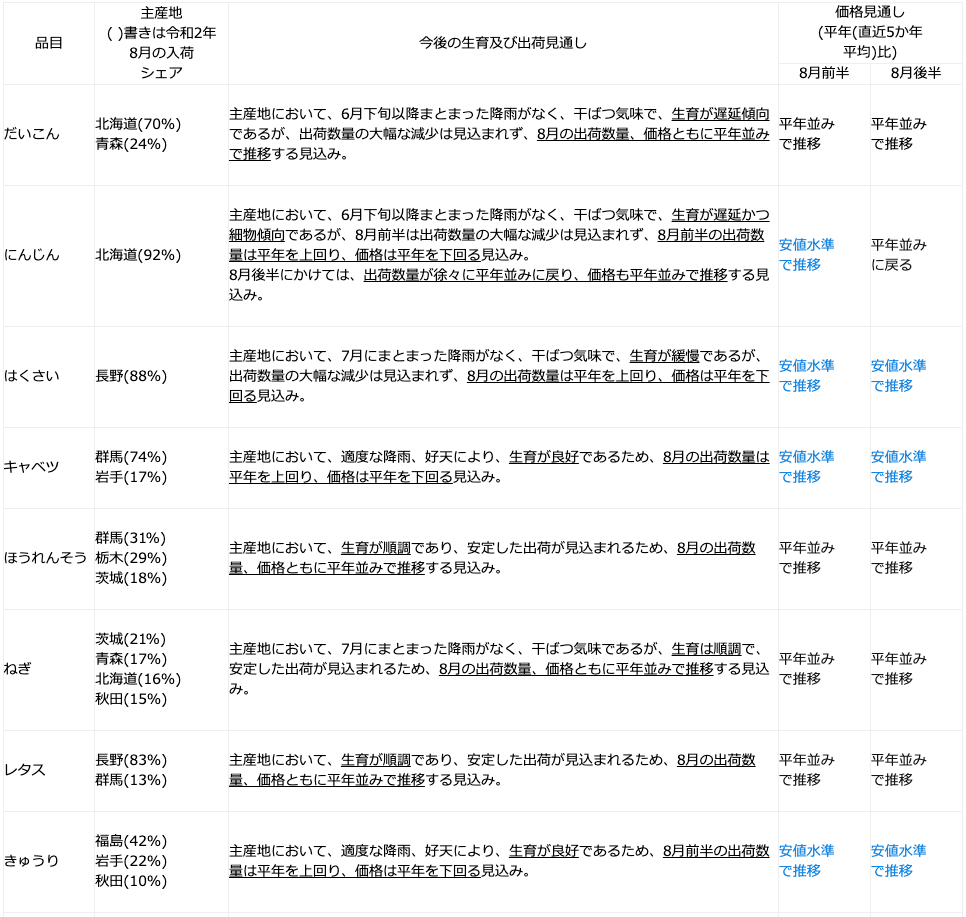 野菜の生育状況及び価格見通し(3年8月) にんじん(8月前半)、はくさい、キャベツ きゅうり、なすがお買い得の見込み(農水省) |