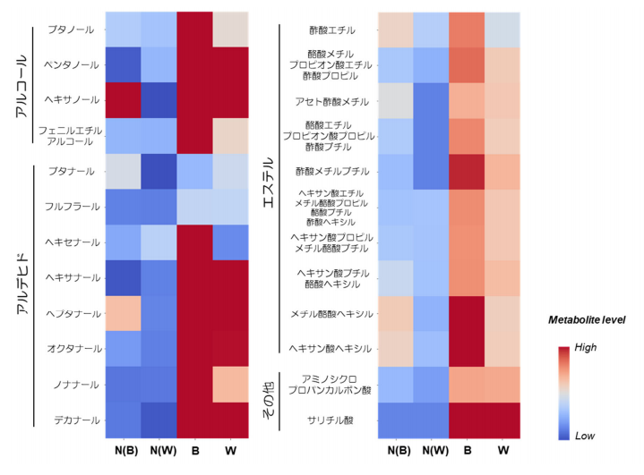 (B),蜜部(W))におけるヒートマップを用いた揮発性代謝物の比較
