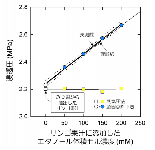 そこで2つの浸透圧計を併用して、人為的にリンゴ果汁にアルコールの主成分であるエタノールのモル濃度が50、100、150、200 mMになるように調整したモデル果汁液を用い、蒸気圧法による見かけの浸透圧と凝固点降下法による実際の浸透圧を測定、比較している。蒸気圧法で求めた浸透圧はエタノール濃度に関わらず、測定した範囲で浸透圧は同じ値でしたが、凝固点降下法で求めた浸透圧はエタノールの体積モル濃度と高い相関を示した(図3)。