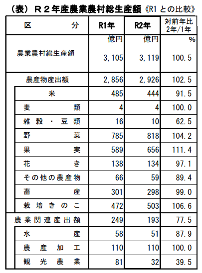 令和2年産の県内の農業農村総生産額は、新型コロナウイルスの影響により農業関連 産出額が減少したものの、台風等の影響があった前年に比べて農産物産出額が増加したことから、前年を上回る3,119 億円(対前年比 100.5%)となりました。
