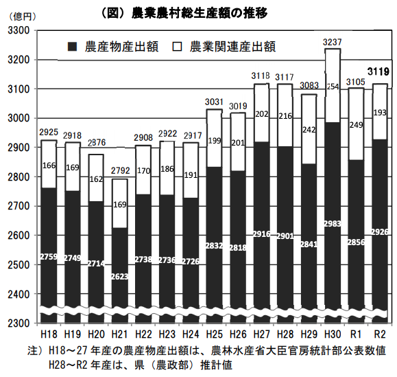 農業農村総生産額3,119億円(農産物産出額2,926億円、農業関連産出額193億円)