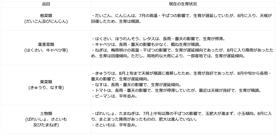 今般、令和3年9月の野菜の生育状況及び価格見通しの聞き取り結果を次のとおり公表ししている。なお聞き取りを行った14品目の野菜の生育状況は、東京都中央卸売市場外において流通するものについても同様の傾向だ。またこれまでの公表資料は、次のURLページで公開している。https://www.maff.go.jp/j/seisan/ryutu/yasai_zyukyu/