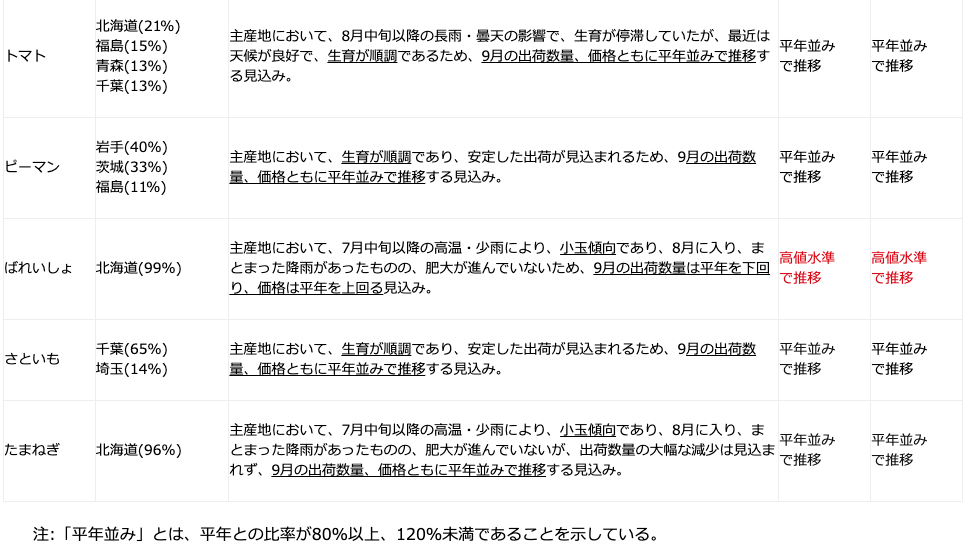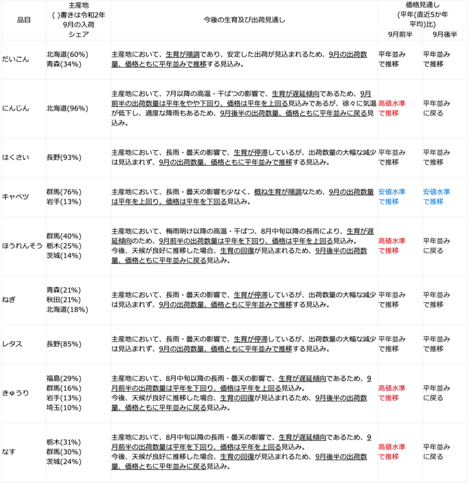 農林水産省は、東京都中央卸売市場に出荷される野菜の生育状況及び価格見通し(令和3年9月)について、主産地等からの聞き取りを行い、その結果を公表している。