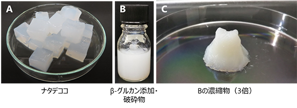 A:市販のシロップ漬けナタデココ、B:ナタデココを脱糖後にβ-グルカンの共存下で破砕して製造したナタピューレ、C:Bの試料を遠心分離して沈澱部として回収した3倍濃縮物。