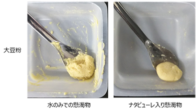 ⑤ナタピューレは、粉末化した食材をペースト化する際の結着性を向上させる。 図2に示すように大豆粉のペーストでは一部が匙や皿に付着するが、ナタピューレを添加するとペーストが結着し硬くなることで付着が抑制される。