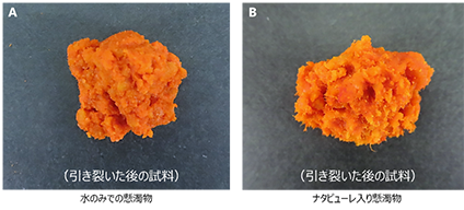 A:ナタピューレの代わりに水を添加した試料、B:ナタピューレを添加した試料、それぞれの試料を指で細かく引き裂いたもの。