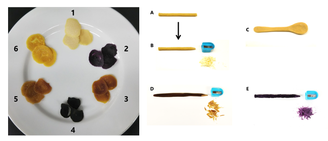 (右)食品粉末をナタピューレおよびグリセロールと共に混練した後の成形•乾燥物:A-C:大豆粉、D:キャベツ粉、E:紫芋粉.A:棒状に成形した乾燥物、B、DおよびE:棒状に成形した乾燥物を鉛筆削りで一部削り取った様子、C:匙状に成形した乾燥物(表面研磨後のもの)。
