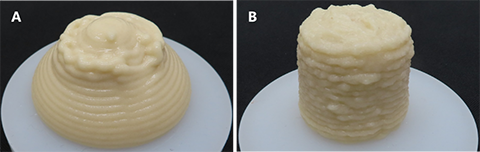 ⑧ジャガイモ粉にナタピューレを混合すると硬さが増すことに注目して、3Dフードプリンタでの加工範囲を低濃度側に拡大することができる。例えば、円筒状の積層成形物を作製する場合、 図5に示すように、水だけで懸濁したジャガイモペーストでは20 %の濃度では積層が上手くいかず、濃度を22.5 %に上げて硬さを増した条件下でも、円筒の下部が押されて拡がった成形物となった( 図5A)。それに対してナタピューレを使ったペーストを用いると、20%の濃度で円筒状が維持された( 図5B)。このようにナタピューレの使用によって、3Dフードプリンティングに適したペーストの濃度を低濃度側にシフトできる。