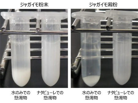 ⑩ジャガイモ粉またはジャガイモ澱粉に水に加えて攪拌後に静置すると、いずれも速やかに沈澱する( 図6)。それに対してナタピューレを懸濁した液中に加えると、どちらも白濁した分散物になる。分散性が高い懸濁液は分注時の均質性が高く、調理加工時に容易に品質を制御できると期待される。