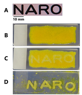 A:レーザー加熱部位(「NARO」の文字部を選択的に加熱)、B:ナタピューレにターメリック粉末およびカードラン粉末を懸濁してスライドグラス上に配置したもの、C:Bをレーザー加熱したもの、D:Cの試料を水洗浄して、ゲル化した部分を残したもの。