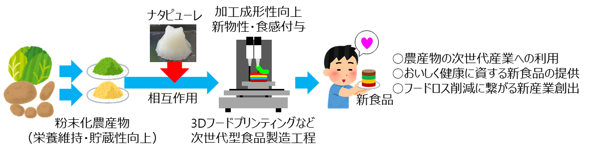 また、余剰•規格外農産物などの未利用資源や野菜加工時の副生物などを乾燥•粉末化した食素材に本技術を適用し、3Dフードプリンティングやレーザー加熱などの次世代型食品製造工程に用いることで、粉末由来の食品に新しい食感などの特性を付与できるものと期待されている( 図8)。今後は次世代型食品製造工程におけるナタピューレの利用技術開発を進め、おいしく健康に資する新食品の提供とフードロス削減に繋がる新産業の創出を目指す。