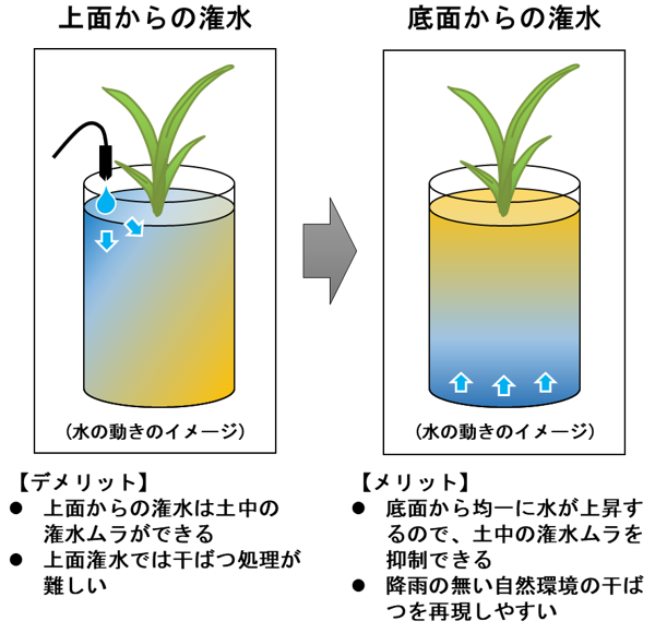 従来、多くの研究者は干ばつに対する植物の生育を調査する際、茎葉などの地上部の変化に関心を持ち、潅水の方法が根の生育に及ぼす影響を考慮していなかった。自然環境で起こる干ばつでは地表から土壌が乾燥することから、これまで主流であった地表からの潅水による土壌水分の分布は不自然と言える。そこで、我々は土壌水位をより自然な形で制御できるように底面から潅水(かんすい)するアイデアを思いつきました。