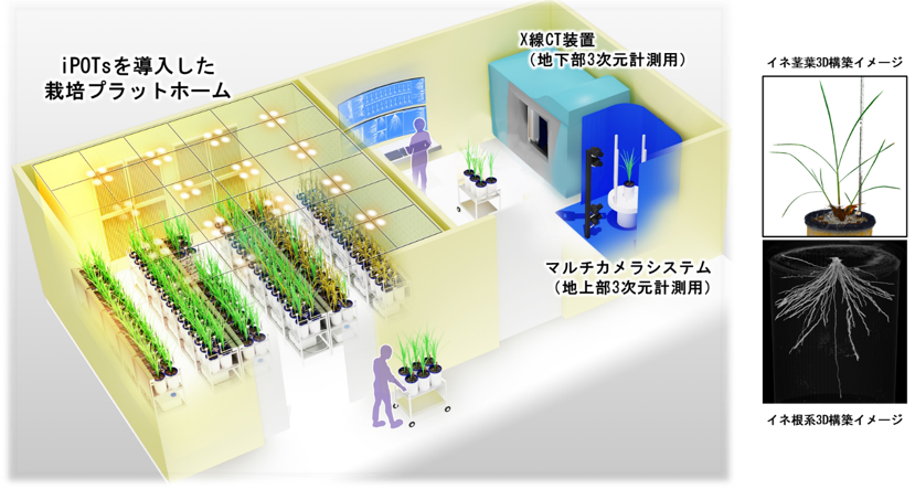 同研究グループでは、迅速な作物開発をめざし、我々がこれまでに開発した作物の地上部•地下部3次元非破壊計測システム a)b)とiPOTsを一体運用することを始めた。世界に類を見ないハイスループットな屋内型作物栽培•計測プラットホームとして、干ばつに強いイネをデザインするための開発に利用している( 図4)。iPOTsの正式な製品化は現時点では未定だが、今後他の研究者や民間企業の方に広く利用していただけるように、改良を重ね製品化を検討したいと考えている。