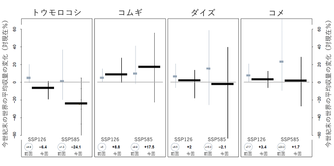 12の収量モデルで予測した今世紀末(2069-2099年)の世界の平均収量に対する気候変動の影響。現在(1983-2013年)の世界の平均収量を基準として将来の収量変化が現在収量に対する割合で表示している。縦棒は複数の収量モデルによる予測の幅。気候変動が進行するシナリオ(SSP585)と気候変動が今世紀半ばで安定化するシナリオ(SSP126) 7 )を用いた。黒線は今回の予測、灰色は前回の予測。各パネルの下の数字は複数の収量モデルによる予測結果の平均値。