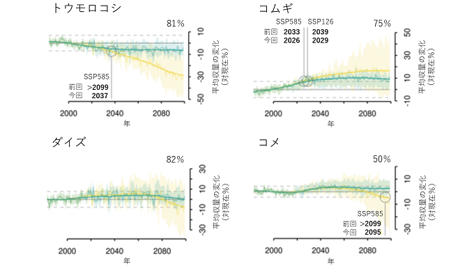 主要生産国の多い中緯度地域ではこうした収量変化がコムギでは2020年代後半から、トウモロコシでは2030年代後半から顕在化すると予測された。これらの時期は前回の予測より10年以上早まっており、気候変動への適応をこれまでの想定よりも早く進めることが必要だ。この研究成果は、2022年に公表予定のIPCCの第6次評価報告書(第2作業部会)に最新の知見を提供するものである。本研究の成果は、2021年11月2日付で国際学術誌「Nature Food」に掲載された。
