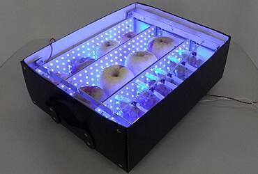 低温の冷蔵貯蔵庫内にこの装置を置き、青色LEDを点灯させると、その熱と装置の吸排気口の調節によって、装置内の温度がそれぞれの果実の着色促進に適した温度に保てる仕組みになっている。直径12cmまでのリンゴなら一回に最大12個を処理できる。