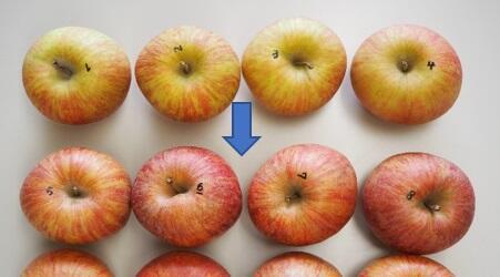 リンゴの着色不良は生産者にとって悩みのひとつだ。着色不良は果実が葉や枝の影になって光が十分当たらないことのほか、肥料のやりすぎや高温などが原因で発生する。生産者は果実に太陽の光がまんべんなく当たるように葉を摘んだり、果実の向きを変えたり、地面に反射シートを敷いたりといった工夫をこらしているが、こうした作業は重労働のうえ、必ず効果が現れるとは限らない。最近は温暖化による高温で着色が進みにくいという問題も発生している。