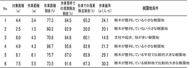 ②樹木が整列している比較的大規模な樹園地における本機の作業能率は、落葉の樹園地外への搬出時間を除いて約30 a/(人•h)であり、手持ちのガーデンレーキを用いた手作業での作業能率は0.9a/(人•h)でした。したがって本機の作業能率は、手作業の約30倍でした。作業箇所での落葉除去割合は8~9割であり、樹冠下など走行作業ができない場所を含めた樹園地全体で見ても5~8割の落葉除去割合でした( 表2)。