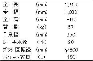 ①本落葉収集機は、回転ブラシ、接地輪、バケットで構成されるスイーパーと落葉収集レーキから成る( 図1、 表1)。乗用型草刈機(既存製品)でけん引する。接地輪の動力で回転するブラシの前方にレーキを配置することで、レーキでかき起こされた落葉を回転ブラシでバケットに収容する。バケット内の落葉を樹園地外の集積所に排出する際は、運転席に座ったままでバケットの持ち上げ及び排出操作が容易にできる。