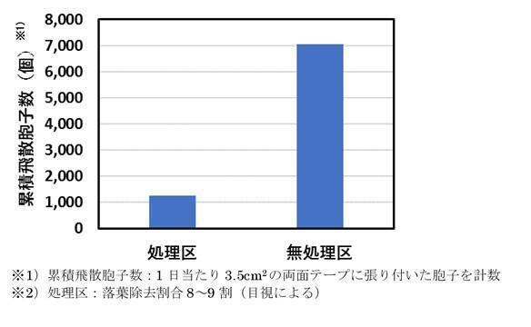③本機で落葉を収集することにより、無処理区に比べてリンゴ黒星病の原因菌の飛散胞子数を減らすことができたことから、リンゴ黒星病の発生低減に寄与できると考えられる( 図2)。