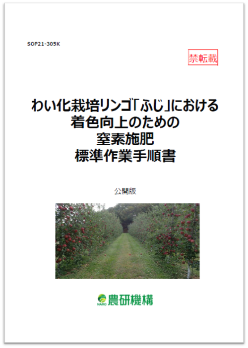 本SOPは、わい化栽培でリンゴ「ふじ」を生産する場合の窒素施肥基準を導入するための手順書である。果実の着色不良が問題となる生産現場において、リンゴ生産者や普及指導機関へ新たな窒素施肥基準を示すとともに、リンゴの生産性や果実品質を低下させることなく着色不良の改善が期待できることを、データを根拠に説明している。