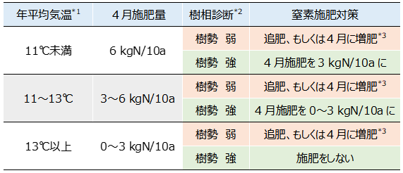 2)を作成し、3月2日にウェブサイトで公開した。栽培地域の年平均気温で施肥量を区分するとともに、樹勢に応じて窒素施肥量を増減する指標などを記載している。