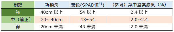 診断時期は新梢長 : 新梢停止期、葉色と葉中窒素濃度 : 7~8月。