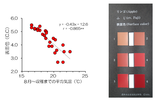 図2. 果実着色時期の平均気温と表面色の関係(左)とリンゴ「ふじ」の表面色カラーチャート(右)