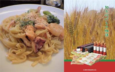 また、同組合は農家レストランなどを営む農業生産法人小川農園(株)(兵庫県姫路市)とコラボして、6種類の「加古川生パスタ」(写真1)を開発し、売り出している。兵庫県内のレストランでも「セトデュール」を使ったパスタ料理(写真2)が提供されている。「加古川パスタ」の開発を支援した兵庫県も普及に並々ならぬ力を入れており、その誕生経過を熱く伝える冊子「加古川パスタ物語」(兵庫県のウェブサイトで閲覧可能)を発行している(写真2)。