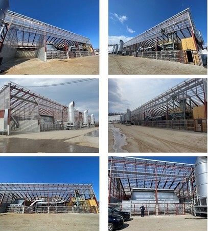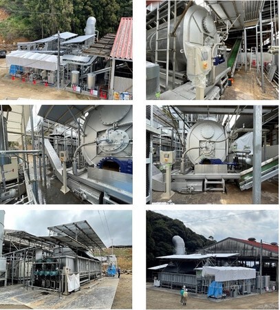 導入したERS:5型(処理容量25トン/24時間)x3台 ボイラー:バイオマスボイラーx2台(RPF燃料使用予定)既存の堆肥舎(全長100m)の中に、ERS5型3台とバイオマスボイラー2台を収めた。