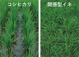 本研究で見出した開張性を付与する野生イネの染色体領域は、コシヒカリ以外の他の日本型の栽培イネ品種にも同様の形質を付与することが可能と考えられる。開帳型イネは雑草抑制力に優れる水稲品種の育成を進めるための育種素材として、活用が期待される。