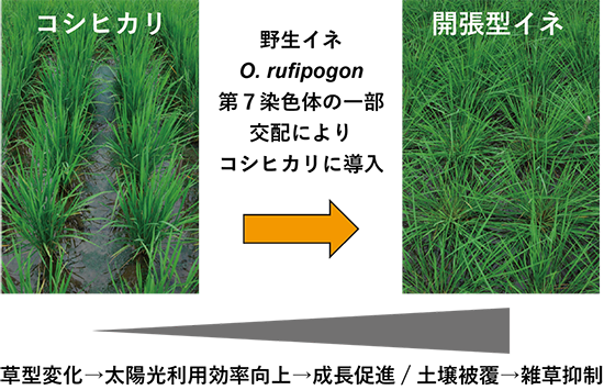 本研究で開発したイネは、野生イネの染色体の一部を交配により取り込んだコシヒカリ。この野生イネ染色体に由来する草型の変化は、成長促進や雑草抑制に貢献した。一方、導入した野生イネの染色体領域は、コシヒカリ同等の収量や米穀品質を示しており、今後、育種活用が期待される。