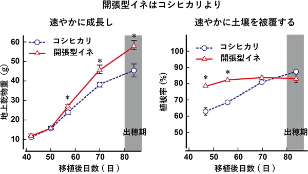 栄養成長期における太陽光の受光態勢が改善されるため、開張型イネはコシヒカリより成長が促進された。また、水稲群落による土壌被覆も速まった(*印のついたデータは有意差がある)。