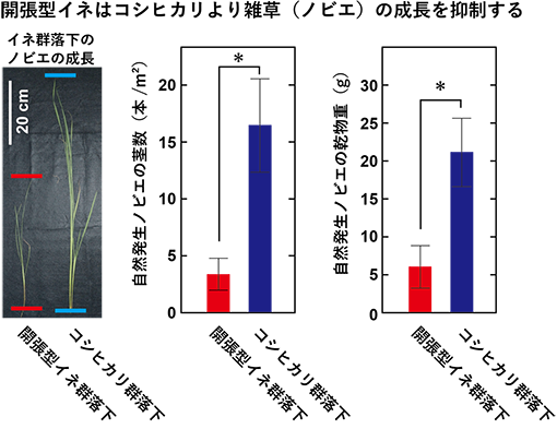 土壌被覆が速まることで、水稲群落下への入射光が減少し、群落下の雑草の成長をコシヒカリよりも抑制できた(*印のついたデータは有意差がある)。