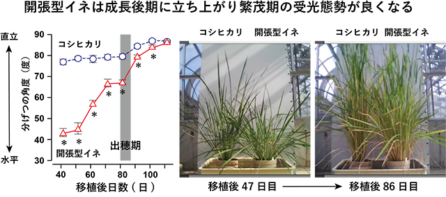 繁茂期は葉同士の相互遮蔽が大きくなるため、葉が直立する方が好ましいとされている。今回開発した開張型イネは、穂の形成期を境に開張型から直立型にダイナミックに草型を変えるため、栽培の全期間にわたって良好な受光態勢を保った(*印のついたデータは有意差がある)。