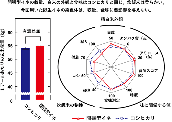 開張型イネの1アールあたりの玄米収量は、コシヒカリと同等であった(有意差はなかった)。精白米はコシヒカリ同様に白く、味に関する値はコシヒカリと比較すると、アミロース含量がわずかに高い以外は同等であった。一方、炊飯米の物性はグラフ中心に値が近づくほど炊飯米が柔らかいことを示しており、開張型イネから得られた米は、コシヒカリよりも柔らかく炊けることが示された。
