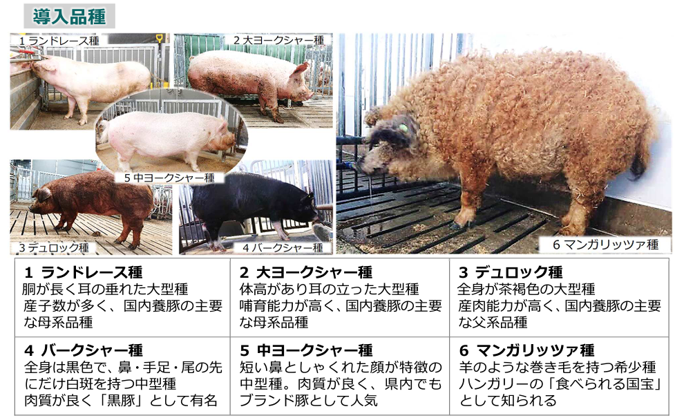 畜産試験場では、令和元年9月の豚熱発生により休止していた養豚事業を昨年度に再開した。この度、事業再開に伴い進めてきた豚の導入が完了し、公設試験場では全国初の導入となるマンガリッツァ種を含めて6品種が揃った。
