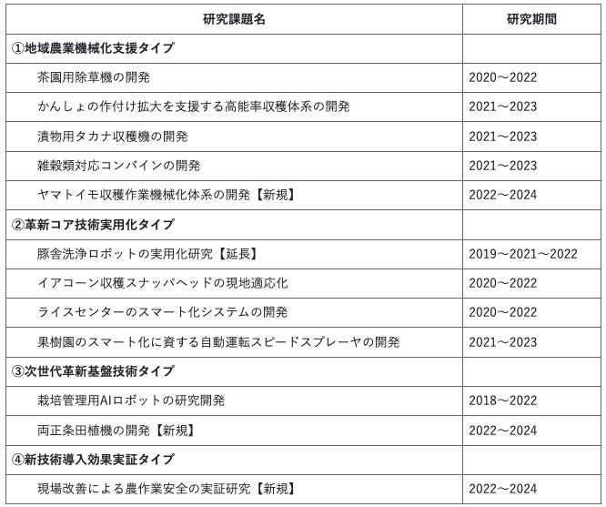 農研機構では生産現場等からの要請対応やスマート農業の推進のため、農業機械技術クラスター事業の令和4年度の実施課題として、