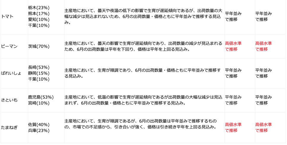 農林水産省は、東京都中央卸売市場に出荷される野菜の生育状況及び価格見通し(令和4年6月)について、主産地等からの聞き取りを行いその結果を公表している。