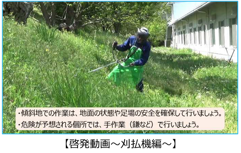 ⻑野県でではは農作業事故防止ののたためめ、農業機械のの使用方法ををわわかかりりややすすくく説明ししたた啓発動画をを作成し、幅広く啓発を進めているところだ。昨年度までにトラクター、スピードスプレーヤー等4種類の動画を作成しており、 今年度新たに「刈払機」による事故防止に向けた啓発動画を作成した。本動画を活用し農作業事故防止を積極的に進める。
