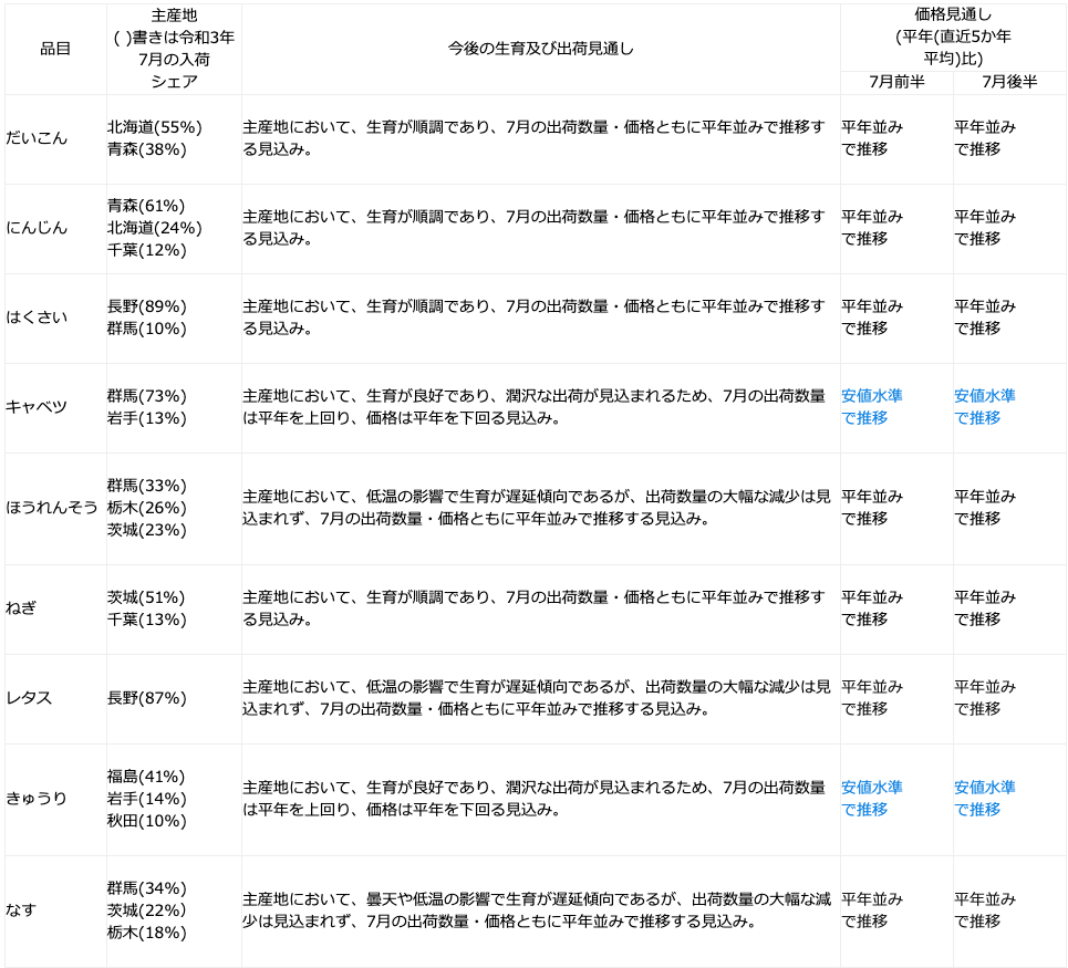 この見通しは、直近の生育状況及び今後の生育と出荷の見通しから予測される、今後の価格見通しを公表することで、産地の出荷判断と消費者の購買行動の最適化を促し、野菜の供給及び価格の安定を図ることを目的としている。