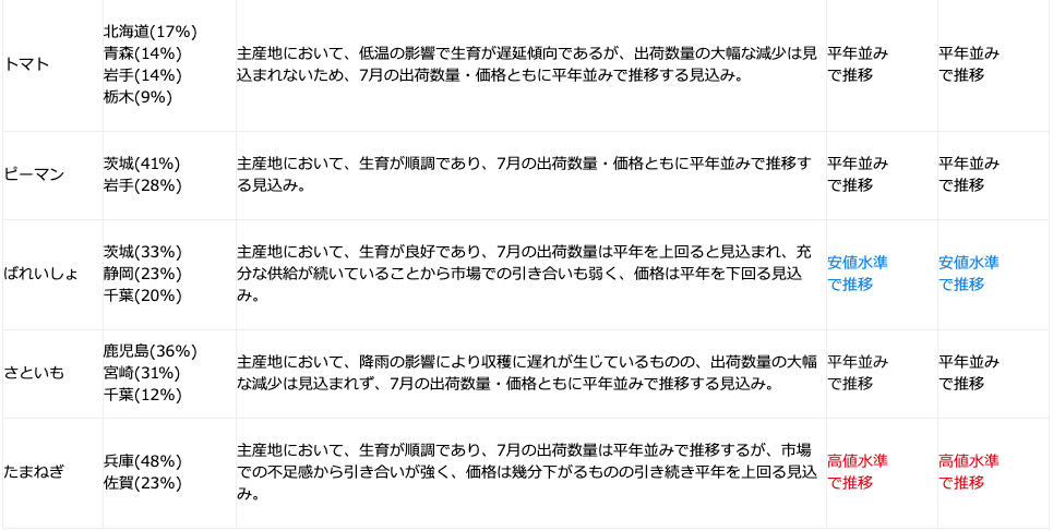 今般、令和4年7月の野菜の生育状況及び価格見通しの聞き取り結果を次のとおり公表している。なお、聞き取りを行った14品目の野菜の生育状況は、東京都中央卸売市場外において流通するものについても同様の傾向だ。また、これまでの公表資料は次のURLページで公開している( https://www.maff.go.jp/j/seisan/ryutu/yasai_zyukyu/)。