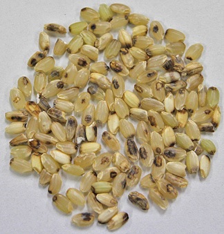 図1.カメムシのの吸汁によって発生した斑点米。米粒が部分的に黒や茶褐色に変色してしまう。