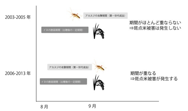 これらの結果は、気象条件に対するイネとカメムシの反応が異なること、その年、地域の気象条件にそれぞれ反応して決まるイネの脆弱期間とカメムシの攻撃期間が一致した場合に、斑点米の被害が発生している可能性を示唆している。