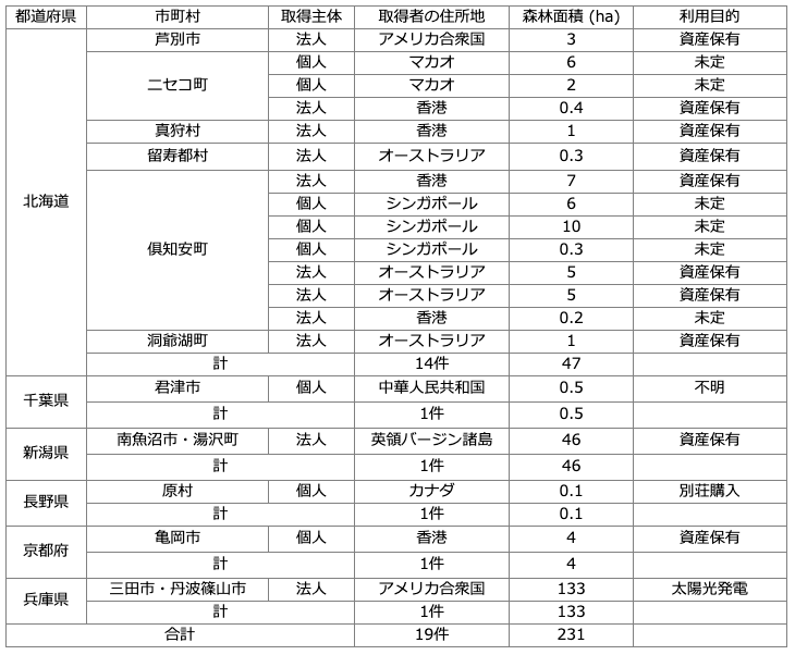 居住地が海外にある外国法人又は外国人と思われる者による森林取得の事例。 調査の結果、確認された事例は次のとおりだ。