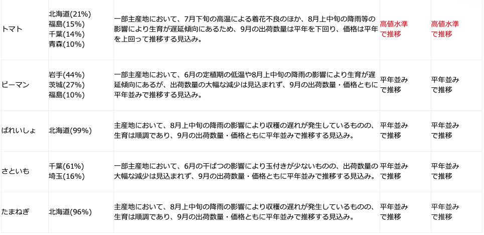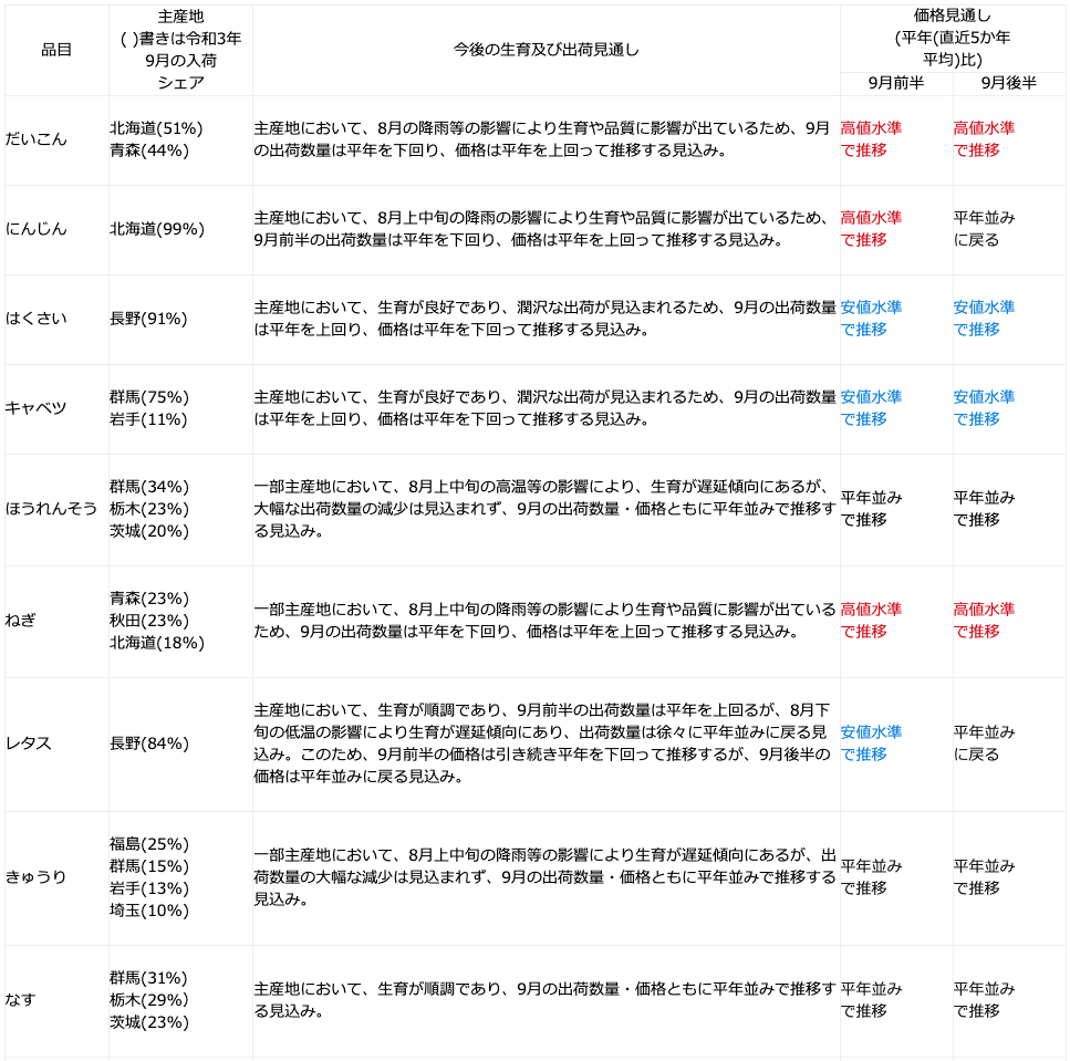 農林水産省は、東京都中央卸売市場に出荷される野菜の生育状況及び価格見通し(令和4年9月)について、主産地等からの聞き取りを行いその結果を公表している。
