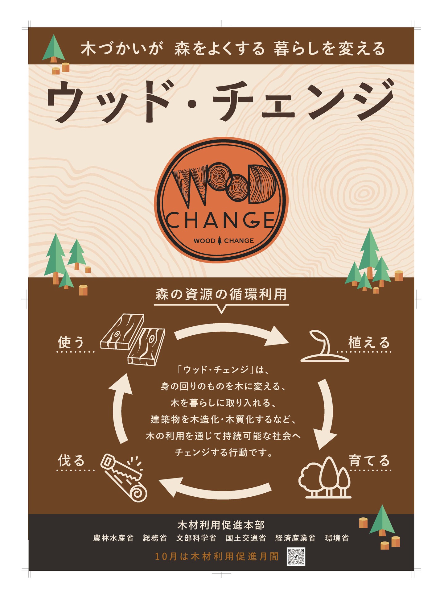 関係省や関係団体等では、ウッド・チェンジロゴマークの拡散やポスターの掲示等によるウッド・チェンジの普及を進めている。ウッド・チェンジロゴマークのダウンロードはこちら(URL: https://www.rinya.maff.go.jp/j/riyou/kidukai/wood-change-logo.html)。