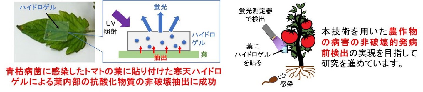 は病原菌(青枯病菌)感染時にトマトの葉の中に生成される抗酸化物質(抗菌物質)を、葉に貼った寒天ハイドロゲルに染み出させ、UV光の照射により非破壊で蛍光検出することに成功した。ヒトの汗成分を検出するために開発した山形大学の独自技術を植物に応用した。従来のELISAやPCR等による病害診断は、発病後に葉や茎、根などを採集し、粉砕するなどの煩雑な前処理が必要である。一方、本手法は発病前に植物体を採集•粉砕することなく、非破壊的に病原菌の感染を検出できる可能性がある。本手法を基盤として、発病前に病原菌の感染を検出する新規病害診断技術の開発•実用化を目指している。