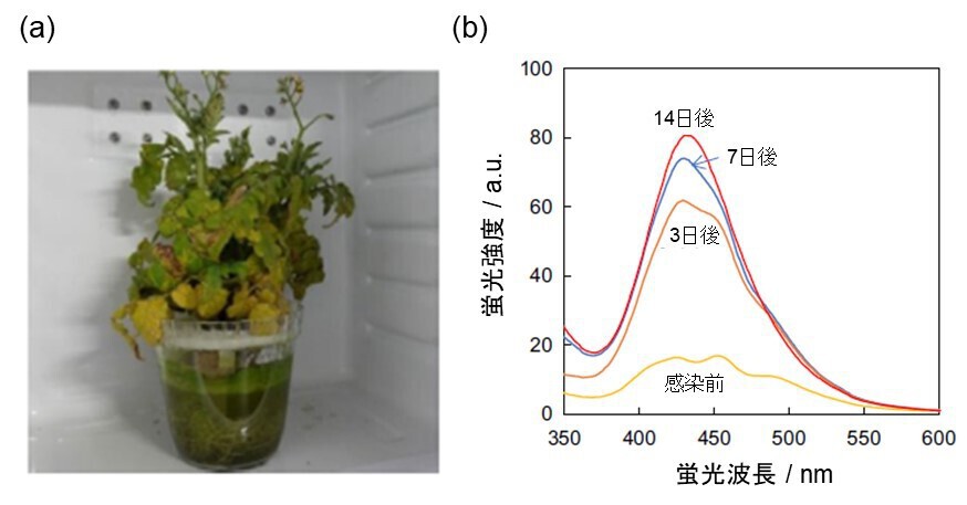 本実験では便宜上、根が細菌懸濁液に浸された日数を感染期間とみなした。感染前と感染後3日目、7日目、14日目に葉を採取•破砕し、メタノールにより生成物を抽出した。この抽出溶液に310 nmの励起光を照射したときに得られる蛍光を分光蛍光計によって測定した。図1(b)はトマト葉内成分のメタノール抽出液の蛍光スペクトル。横軸は検出された蛍光の波長、縦軸は各波長の蛍光の強度を表す。青枯病菌の感染後、波長400-500 nmの蛍光強度が栽培日数と共に増加し続けた。