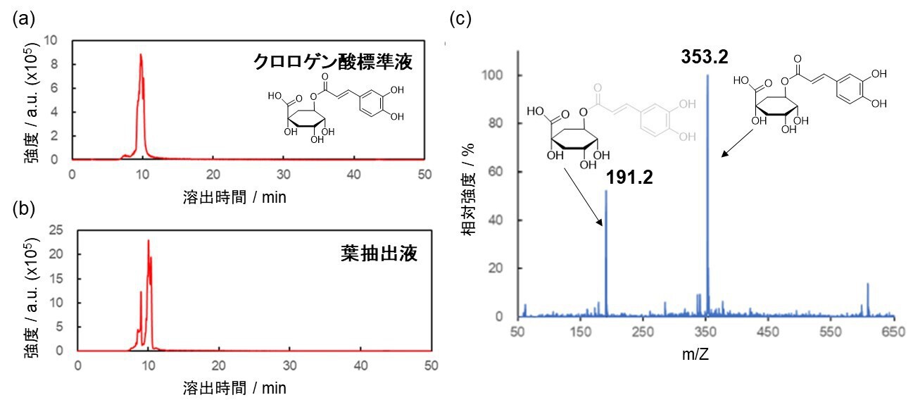 ▲図2(a)、(b)クロロゲン酸標準溶液(a)と、葉のメタノール抽出液(b)のEIC。(c)EICにおける溶出時間10分の溶出成分のMSスペクトル。